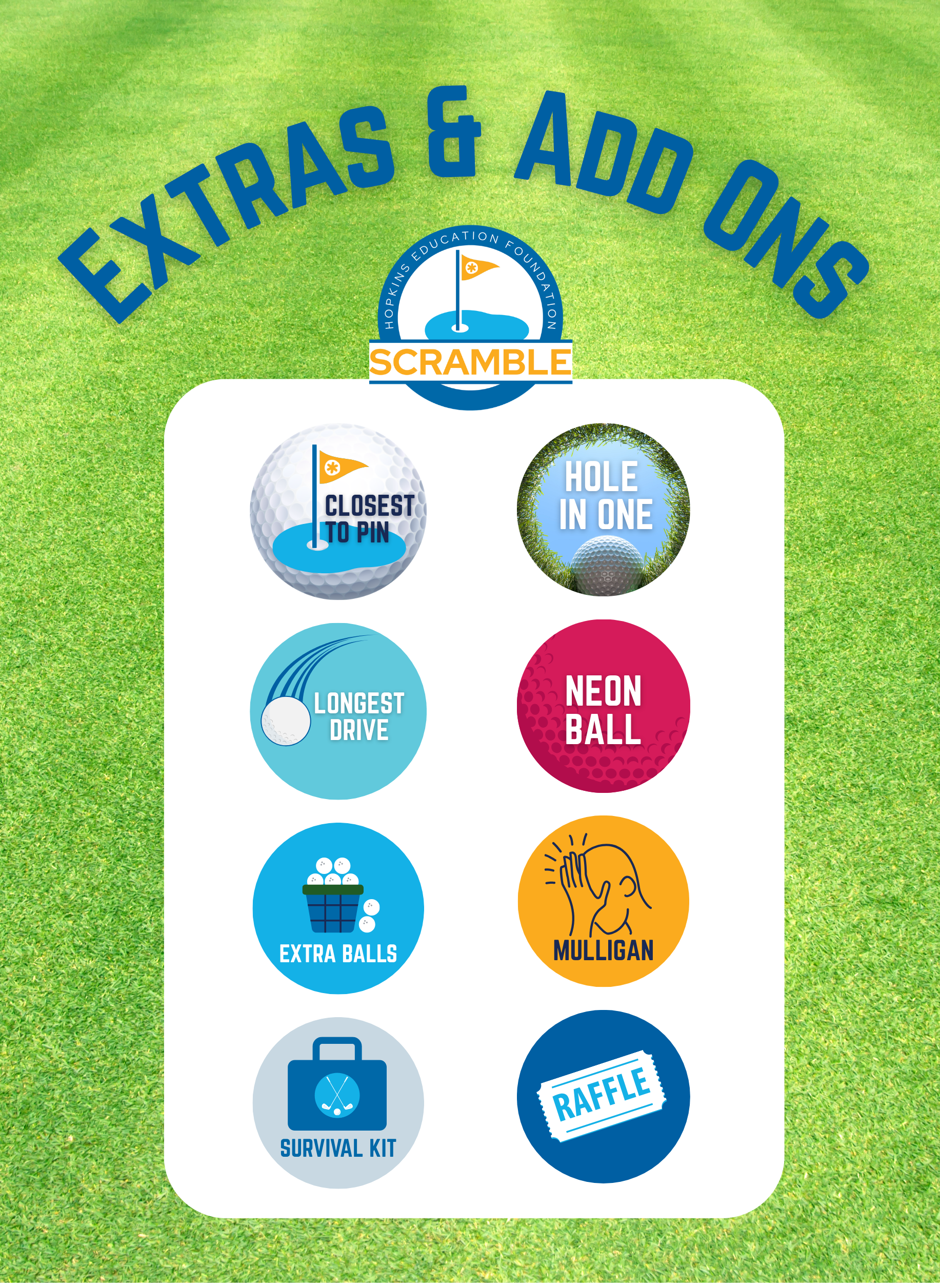 Game play will include challenges at specific holes, opportunities to purchase mulligans and survival kids, and other fun add-ons to make the day special. Available to purchase with cash or card at the scramble.